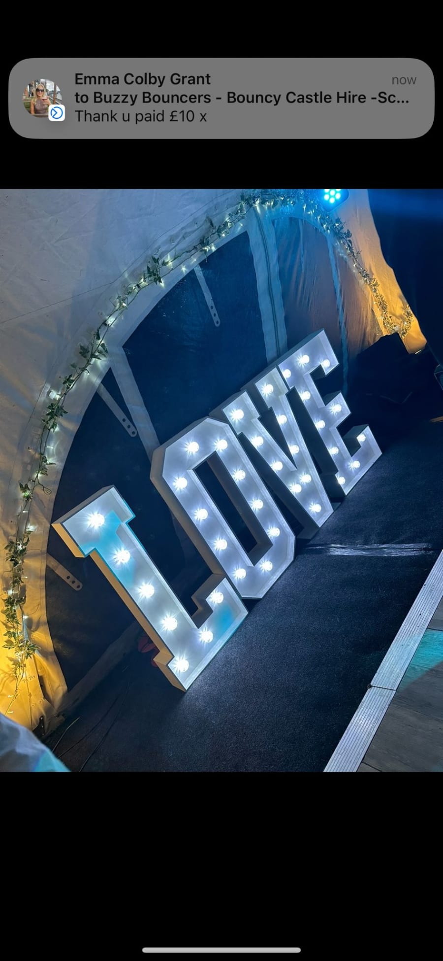 Light Up Love Letters for hire in Barton, Hull, Scunthorpe, Grimsby, Cleethorpes and Doncaster Love letters straight from the heart Let the love shine out Let the happy couple’s love light up the room with these romantic wedding love letters. Standing a full four feet tall, they will shine on the bride and groom from their first dance until they head off for their honeymoon, spelling out their love for all to see. The perfect centrepiece for any wedding display, they’ll match any theme or venue as perfectly as the newlyweds match each other. Light up your wedding photographs Incorporate your light up love letters into your wedding photos, and you’ll get some truly original and unusual pictures to post on your socials and to treasure forever. Gather the family around them for a distinctly different group shot, share the limelight with your best friends or just let the brilliant LEDs light up her wedding dress in style. Built to last Like any good marriage, our love letters are built to stand the test of time. They’re mains powered with bright, long-life LED lights, and unlike some cheaper linked letters, each unit has its own individual power supply and safety system to fully protect them and you. Each letter is free standing and measures around four feet high by two feet wide, making a stunning display that stretches across the room to light up your celebrations. Part of our wonderful wedding range These beautiful light-up love letters for hire in Barton, Hull and the surrounding towns are just part of our extensive wedding hire range, designed to make your marriage memorable. Check out our special silver inflatables including a wedding bouncy castle and wedding slide, and add our wedding ball pool and wedding soft play for your younger guests – or hire them all togetherwith our wedding package deal and save over £50. Book now To get your love up in lights, book your wedding love letters now by clicking the buttons below. But hurry, all the best spring and summer weekend wedding dates will be booked up fast, so don’t delay, click below and book online now. In Beverley, customers choose Infl8 Hire for reliable Bouncy Castle hire backed by themed inflatables from our Themed Bouncy Castles and Bouncy Castle Combos collections.