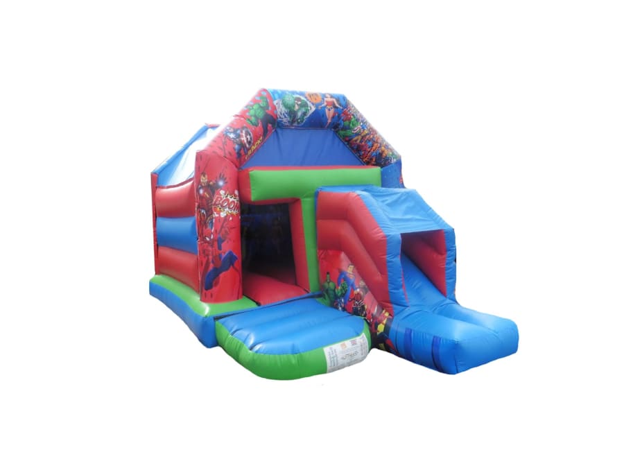 Twin slide superhero bouncy castle for hire in Barton, Hull, Scunthorpe, Grimsby, Cleethorpes and Doncaster